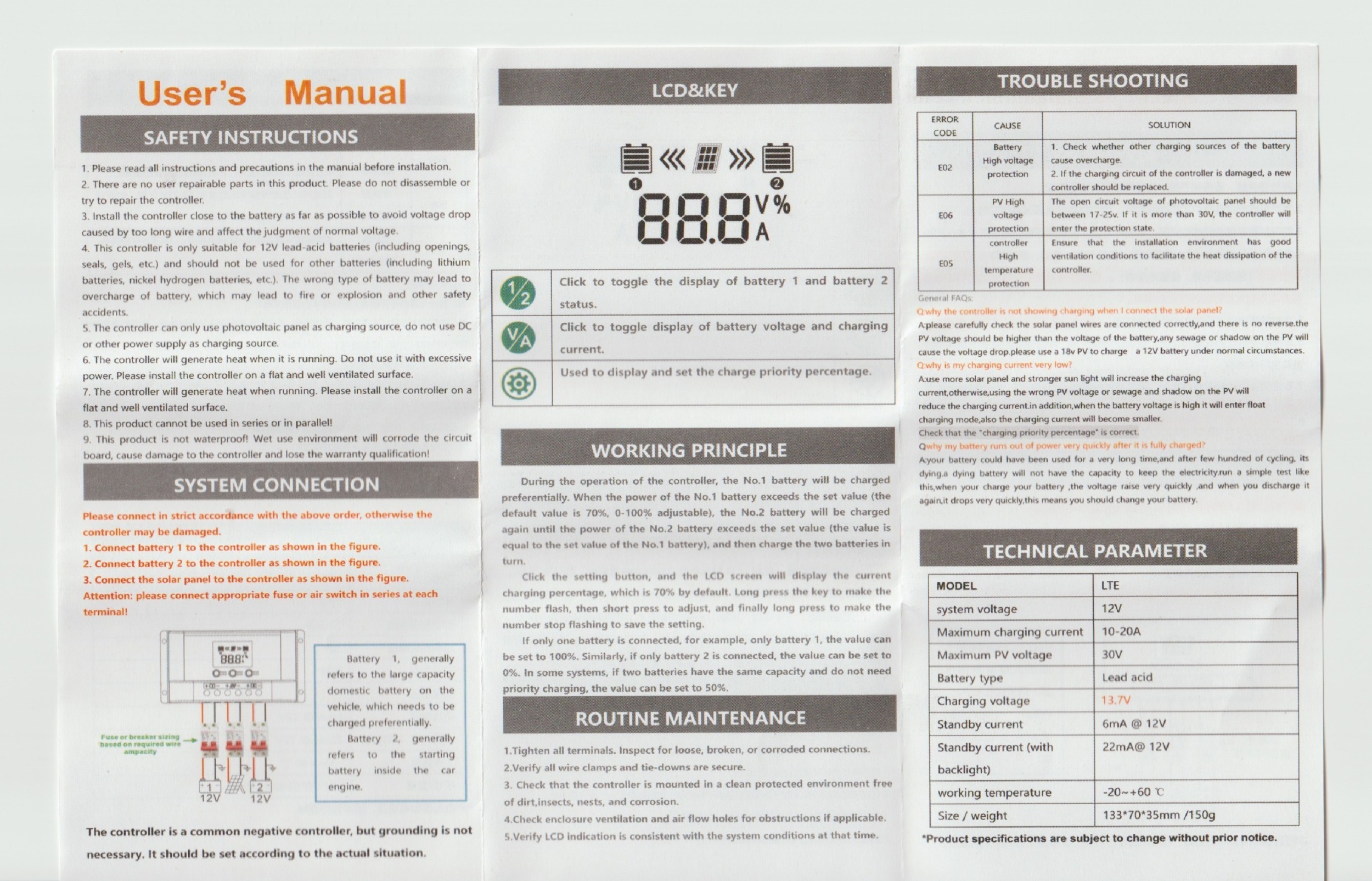 10A 12V Dual Battery Solar Charge Controller with LCD