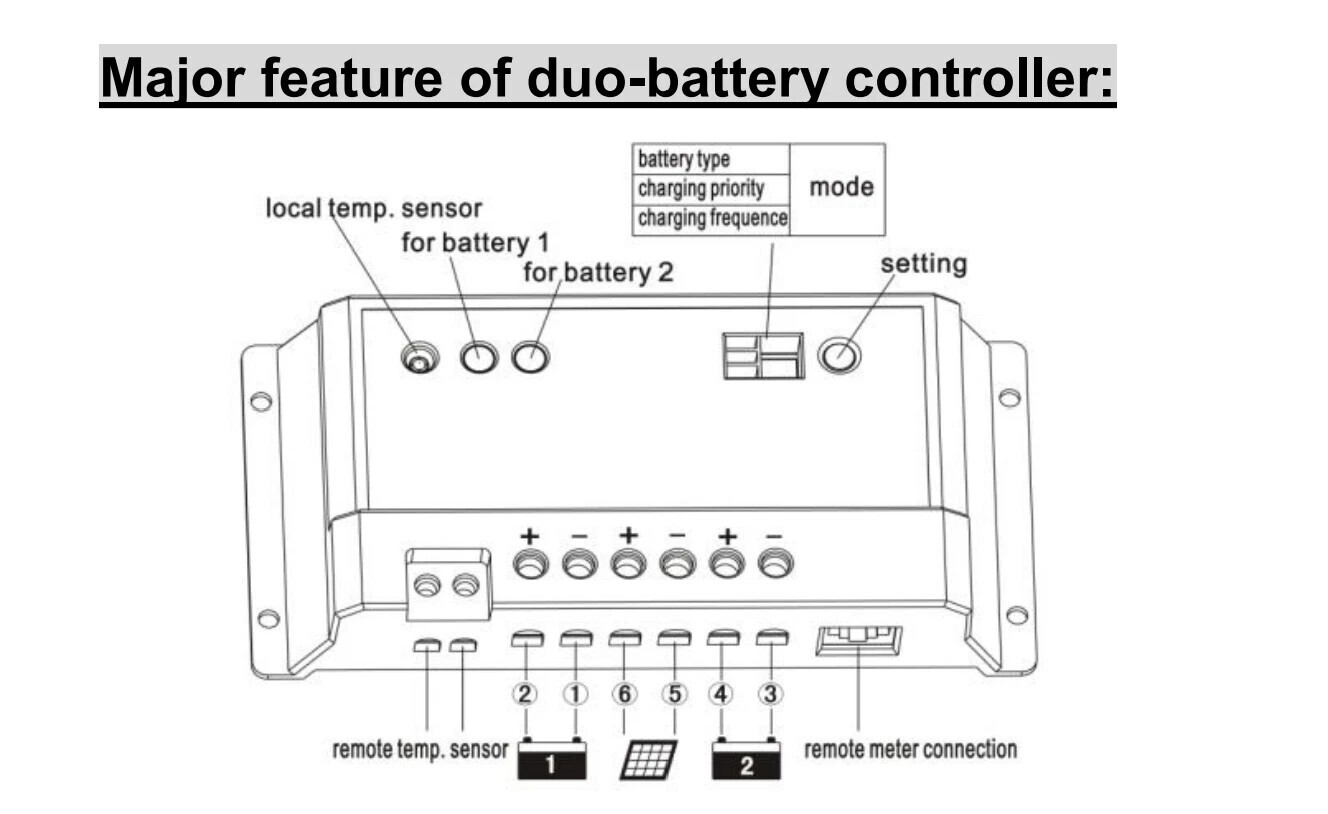 Dual battery controller for the charging of two separately wired 12V or 24V batteries.